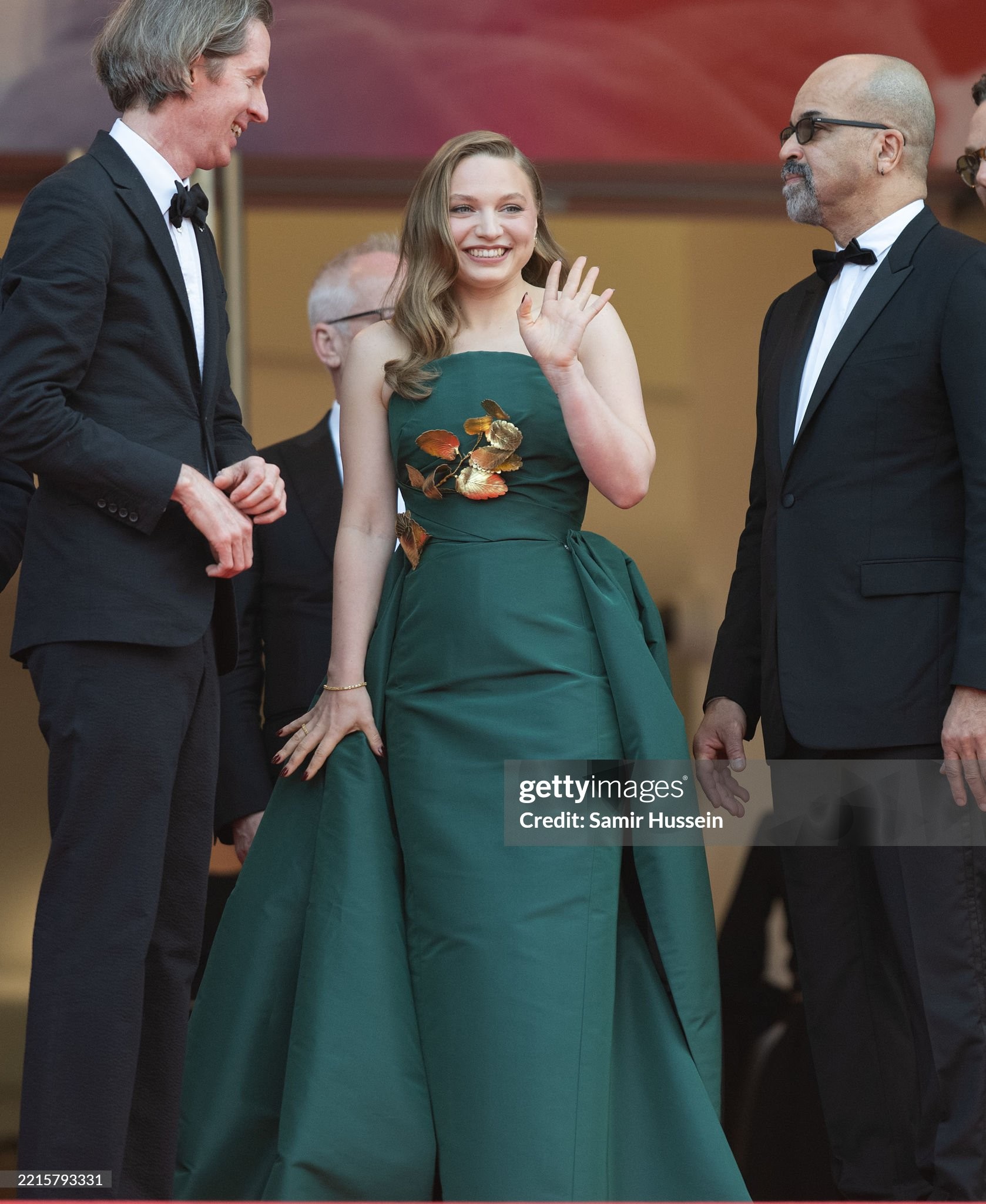 Mia zaszczyciła czerwony dywan oszałamiającą szmaragdową suknią bez ramiączek, z pomarańczowymi liśćmi i zwiewnym trenem.