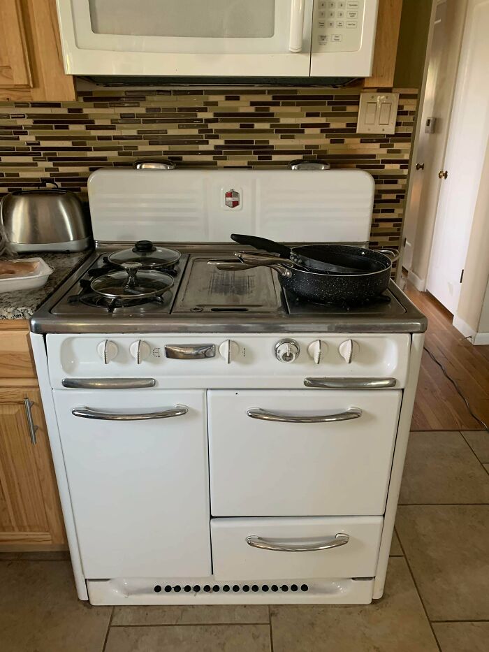 Stary, zamontowany piec wciąż w doskonałym stanie. Sprzęt kuchenny z dawnych lat często był konstruowany z myślą o trwałości.