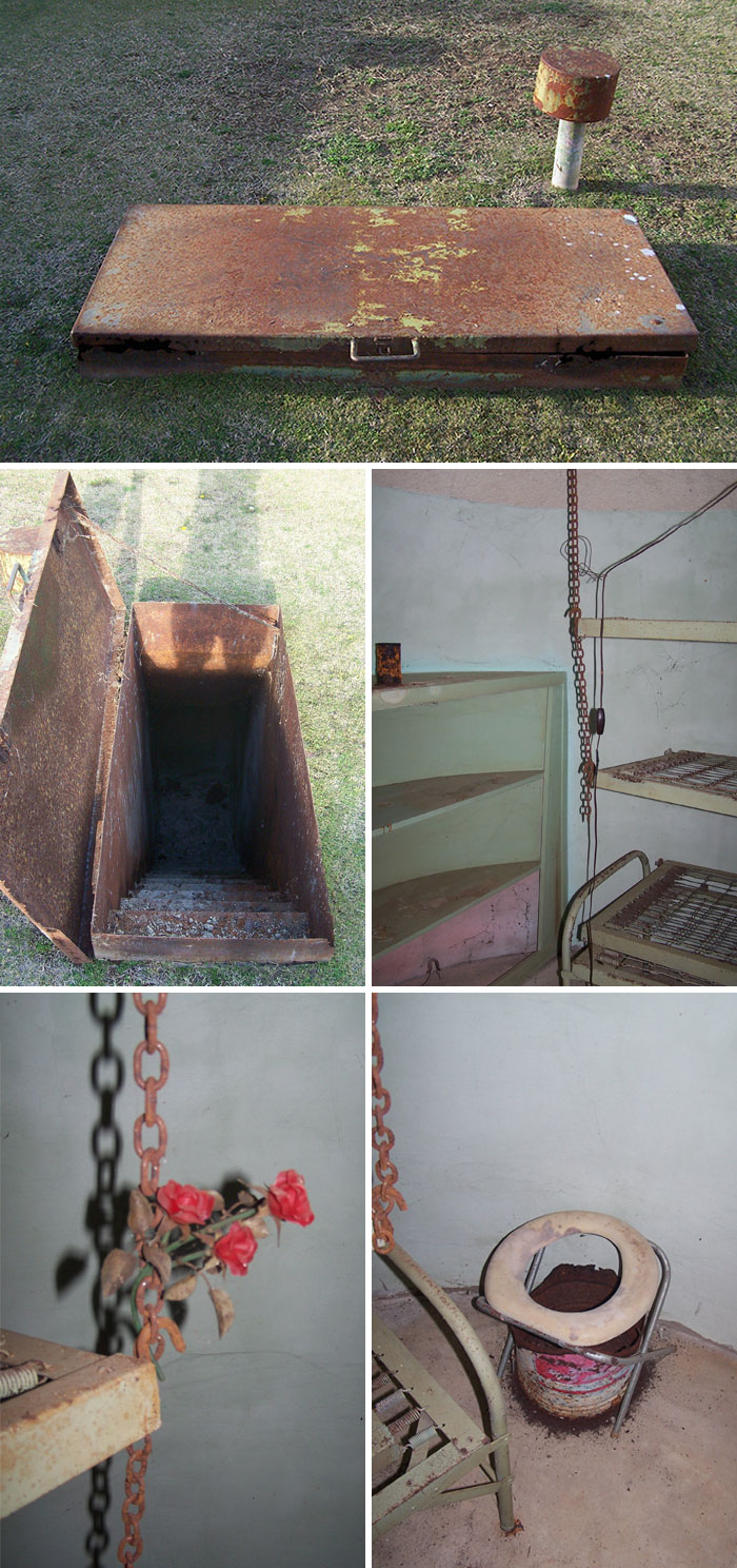 Drzwi mają tylko około 1,2 m wysokości i 45 cm szerokości (lampa dla skali). W drzwiach zamontowane jest oświetlenie, pomalowane na jasnozielono, z metalową kratą od wewnątrz i zewnątrz. Sufit najwyżej nieco ponad 1,2 m — trzeba się było schylić, żeby zrobić zdjęcia. Dom ma około 60 lat; poprzedni właściciel był związany z kościołem.