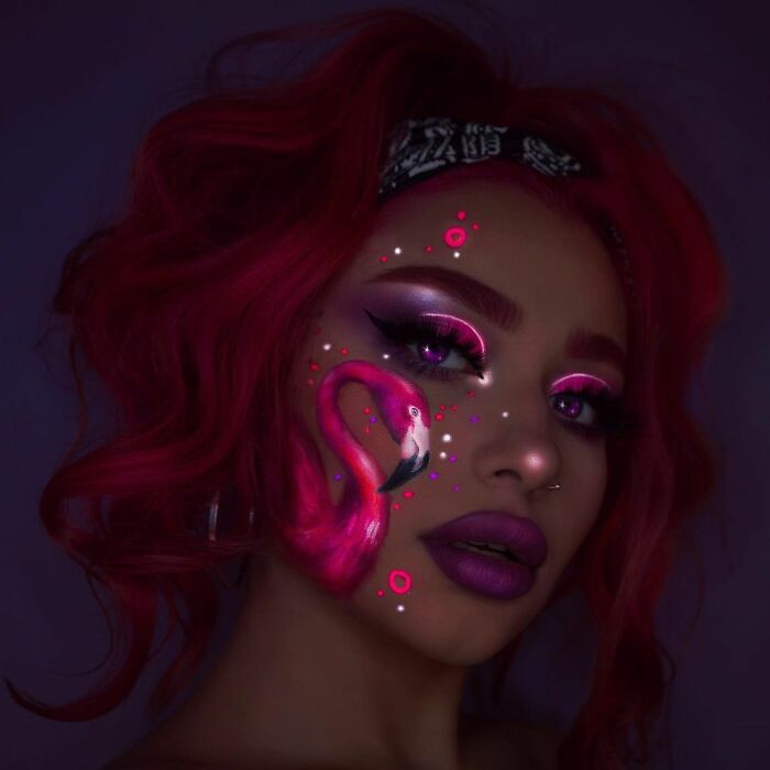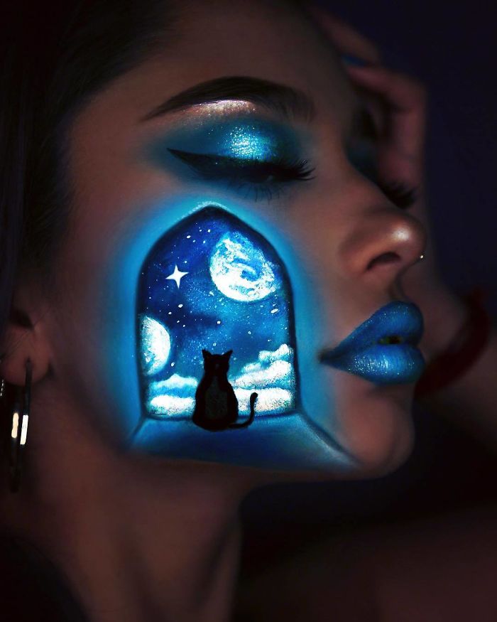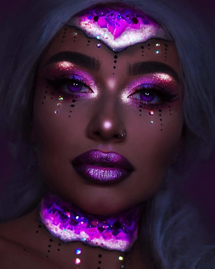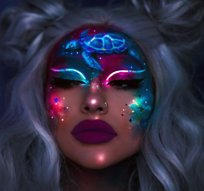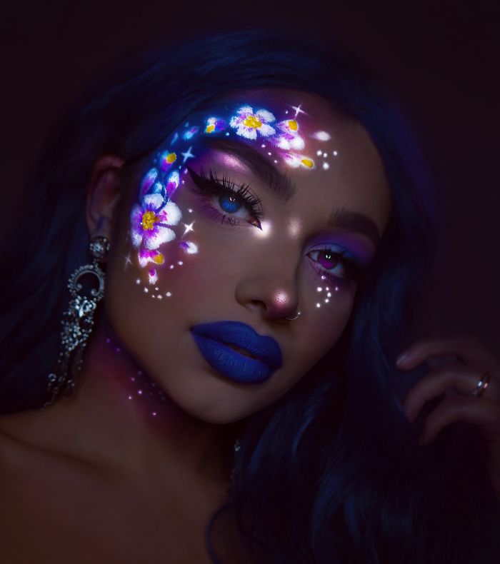 Chciałam jednak pójść krok dalej i zrobić coś, czego jeszcze nikt nie próbował. Po jednym z pełnych, kreatywnych makijaży zaczęłam bawić się oświetleniem. Uzyskałam ciekawy efekt po prostu rozcinając czarną koszulkę i zarzucając ją na softbox — wtedy narodził się pomysł na makijaże świecące w ciemności. Po wielu próbach i błędach opanowałam użycie farb UV, pracy ze światłem i manipulowania oświetleniem tak, by uzyskać efekt prawdziwego blasku.