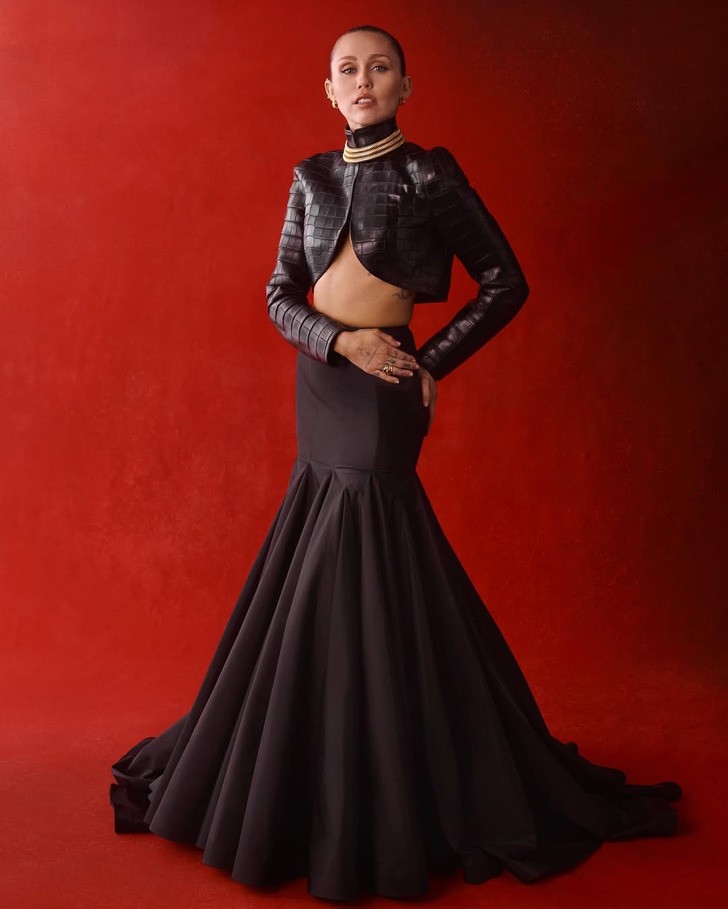 Miley Cyrus założyła kolejną czarną sukienkę eksponującą brzuch, tym razem skórzany top Alaïa w połączeniu z luźną czarną spódnicą. Z włosami zaczesanymi do tyłu w ciasny, błyszczący kok, Cyrus miała na sobie stonowany makijaż i dodatki z odrobiną błyskotek Cartier.