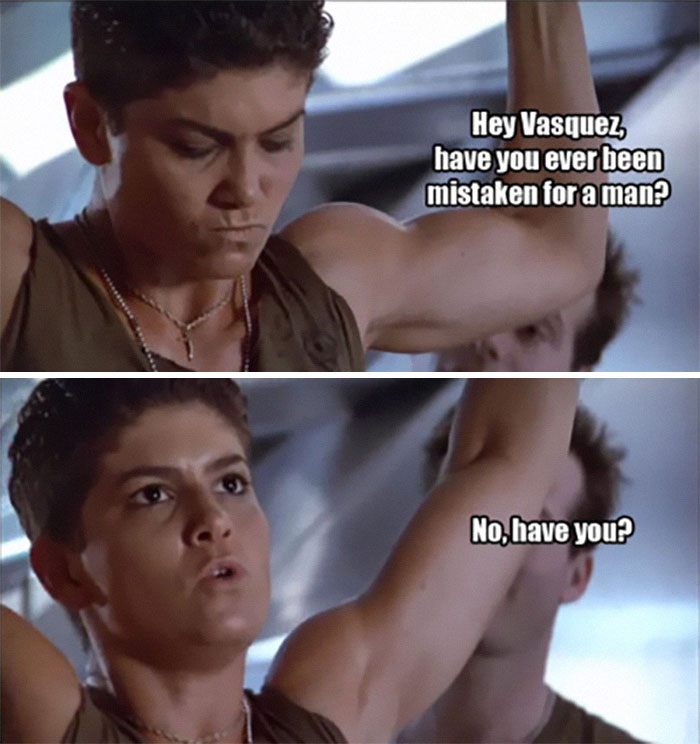 Z filmu Obcy — scena w szatni: Hudson: „Vasquez, czy ktoś kiedykolwiek mylił cię z mężczyzną?” Vasquez: „Nie, a ciebie?”