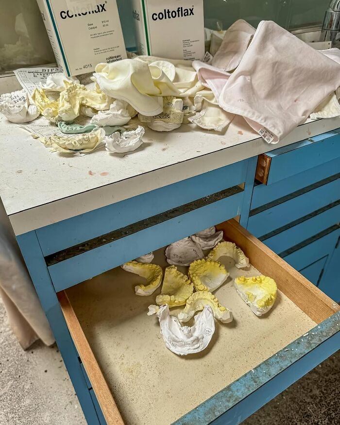 „Przejście przez drzwi było jak wejście do wehikułu czasu. W recepcji na stole wciąż stały starannie ułożone magazyny z 2011 roku. Fotele dentystyczne stały w nienagannym stanie, a instrumenty rozłożone, jakby czekały na następnego pacjenta. Aparaty rentgenowskie, formy, a nawet słoiki z odciskami dentystycznymi pozostały nietknięte. Wyglądało to tak, jakby personel wyszedł na lunch i nigdy nie wrócił.” – dodaje autor zdjęć. Historia opuszczonej kliniki nie jest znana. Zapraszamy do obejrzenia zdjęć!