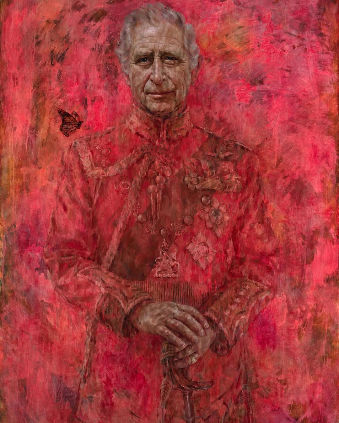 – metamorfoza i przejście, motyl symbolizuje transformację, odzwierciedlając podróż Charlesa od księcia Walii do monarchy podczas tworzenia portretu