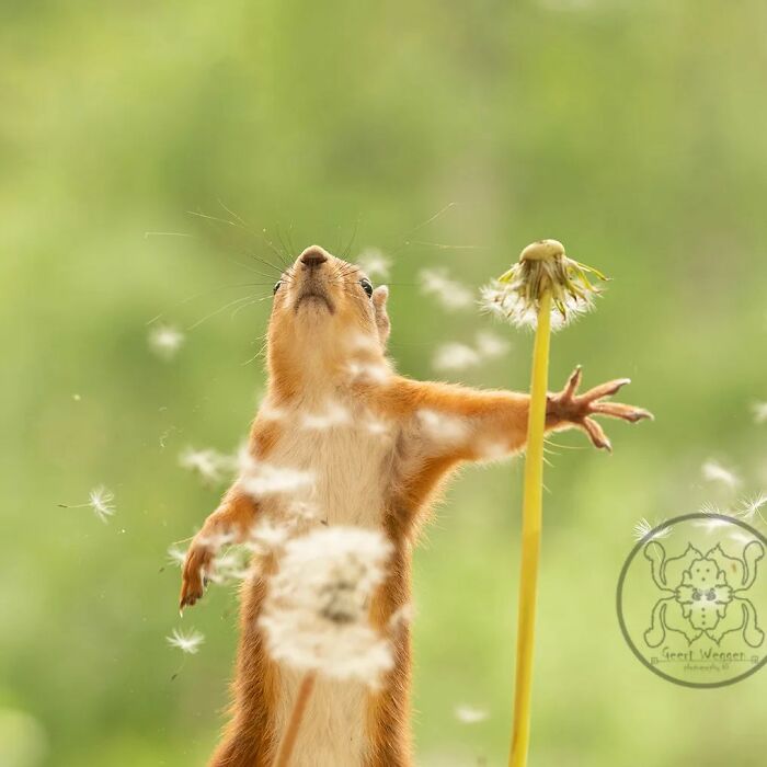 Raz, gdy naprawiał komin, jedna z wiewiórek użyła drabiny i odwiedziła go na dachu. Geert zawsze ma w kieszeniach trochę jedzenia – opowiada, że robił kiedyś sesję wspinając się na drzewo, a wiewiórki szły za nim krok w krok. Nigdy do końca nie wiadomo, kiedy się pojawią i czy zrobią dokładnie to, co fotograf sobie wymarzył.